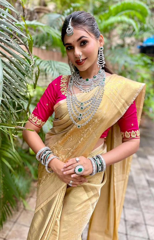Luxurious Kanjeevaram Silk Gold Color Saree With butti weaving blouse