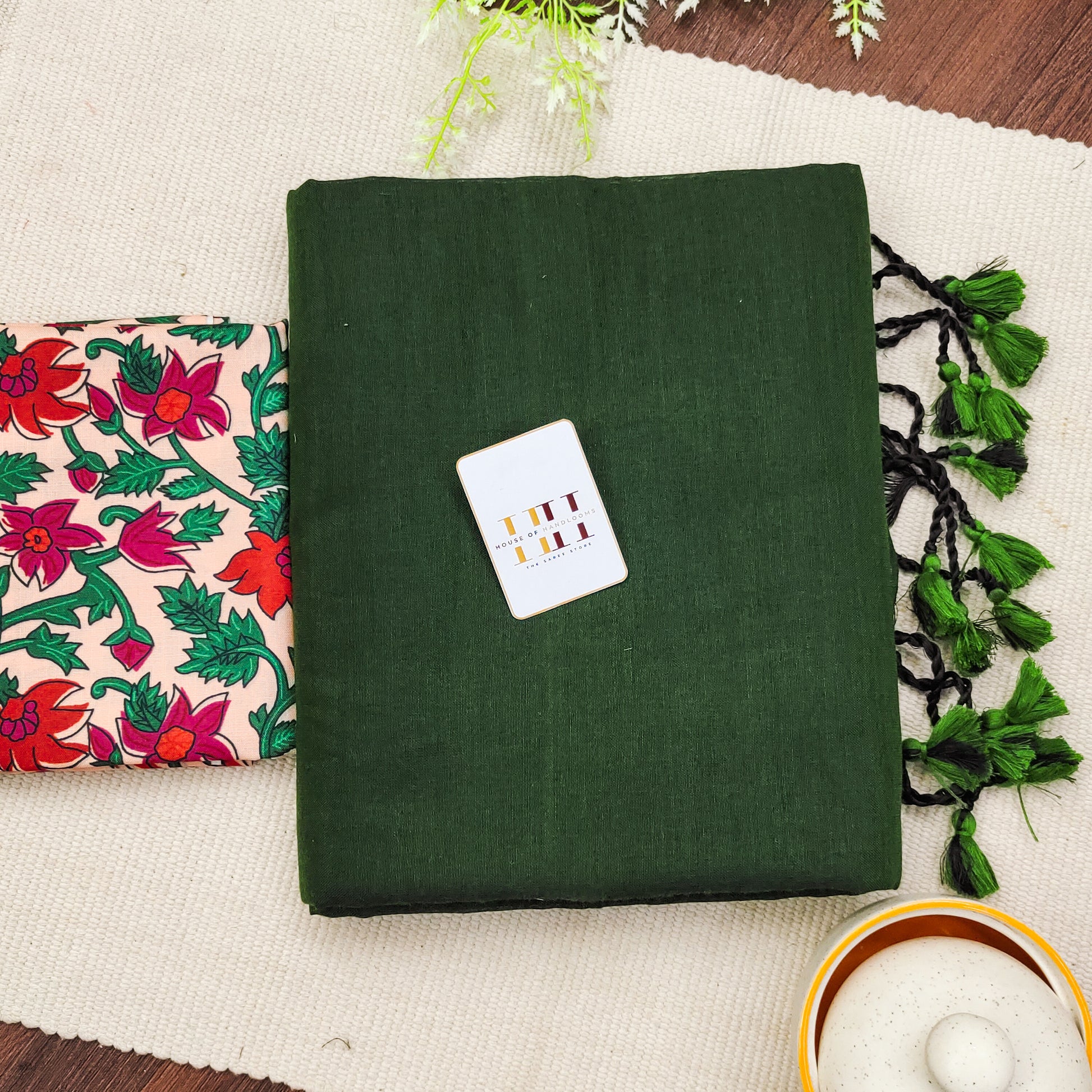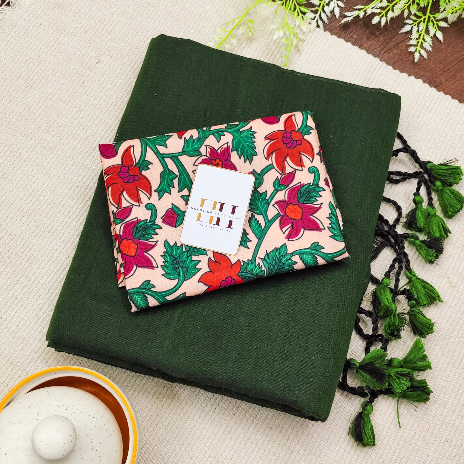 "Elegant Emerald Green Saree with Cream Floral Printed Blouse"