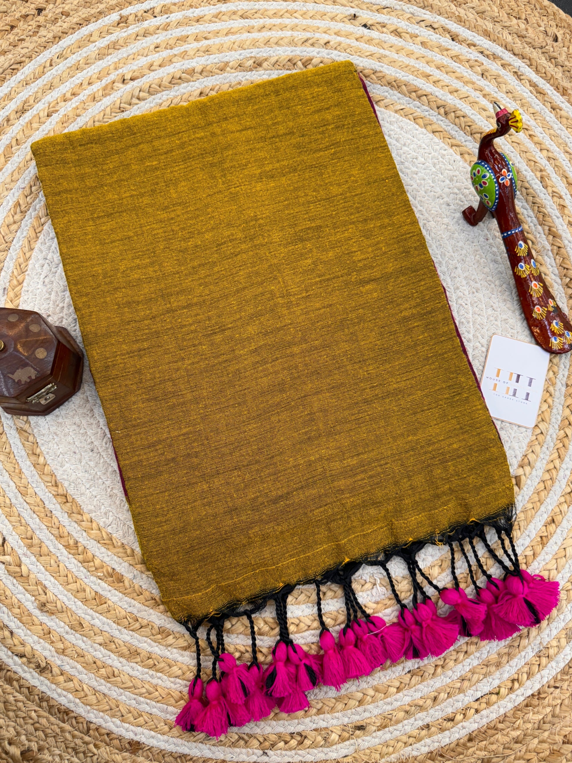 This traditional cotton handloom mustard saree radiates warmth and grace, perfect for a classic ethnic look. Its rich texture and earthy tone are beautifully complemented by a deep wine blouse, adding a touch of sophistication. Lightweight and breathable, it's ideal for festive gatherings or cultural events. A timeless ensemble that blends elegance with heritage.